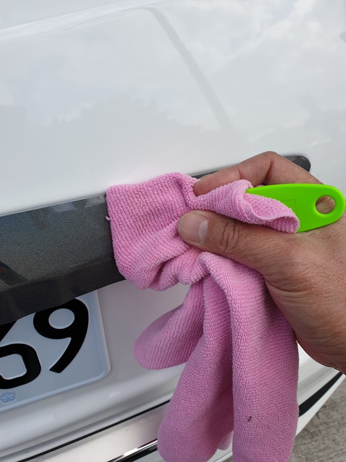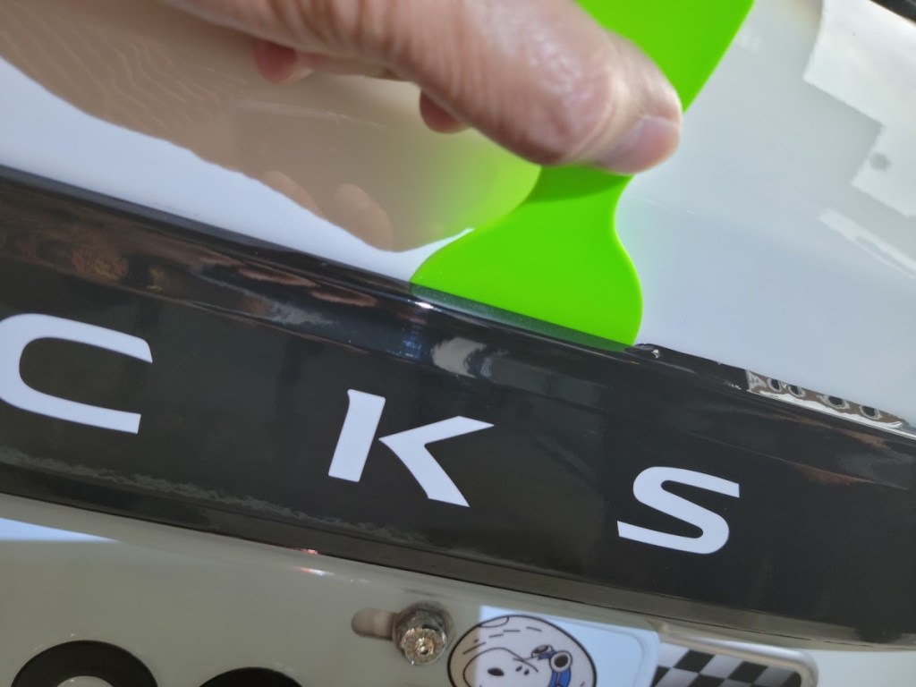 24小時後加強撫平邊緣(因為加了洗髮精的關係,貼膜黏性會短暫變差,剛貼完邊緣會感覺翹翹的黏不牢是正常現象,可待約24小時後內部完全乾燥後,再加強按壓撫平,邊緣多餘的貼膜用刮板塞入縫隙內,方便使用吹風機加熱的話效果最好,不方便的話,使用打火機烘烤或者陽光直接曝曬軟化後再按壓也是很好的方式)